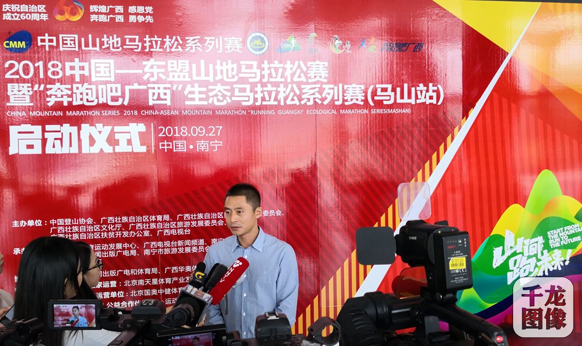 9月27日,中国山地马拉松系列赛 2018中国—东盟山地马拉松赛(马山站)赛事启动仪式在南宁国际会展中心举行。图为国家体育总局登山运动管理中心新项目部主任李文茂接受采访。千龙网发 中国登山协会供图