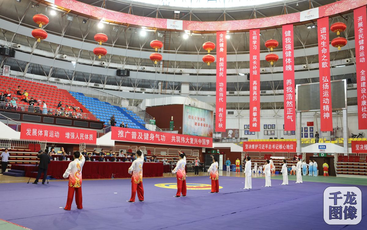 9月27日,首届全国健身气功·八段锦交流比赛大会在北京市房山区良乡体育中心体育馆举行。图为参赛爱好者在比赛中。千龙网发 北京市社会体育管理中心供图