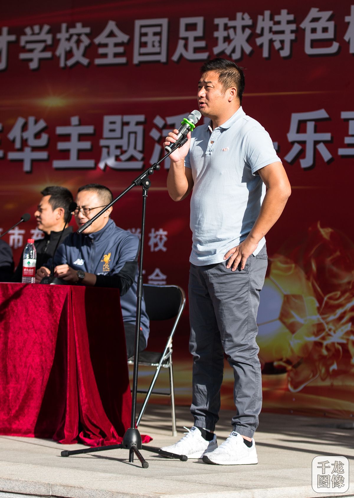 9月30日,北京市东方德才学校全国足球特色校启动仪式暨足球嘉年华主题活动举行,活动通过足球大闯关、桌上足球、足球飞镖、3v3足球争霸赛、有奖知识问答等活动,吸引了全校师生的踊跃参与。图为学校足球运动顾问杨璞致辞。千龙网发 主办方供图