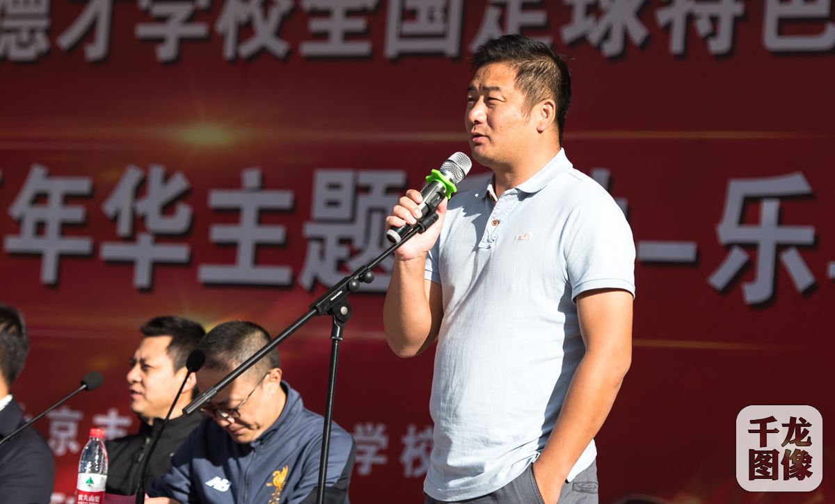 9月30日,北京市东方德才学校全国足球特色校启动仪式暨足球嘉年华主题活动举行,活动通过足球大闯关、桌上足球、足球飞镖、3v3足球争霸赛、有奖知识问答等活动,吸引了全校师生的踊跃参与。图为学校足球运动顾问杨璞致辞。千龙网发 主办方供图