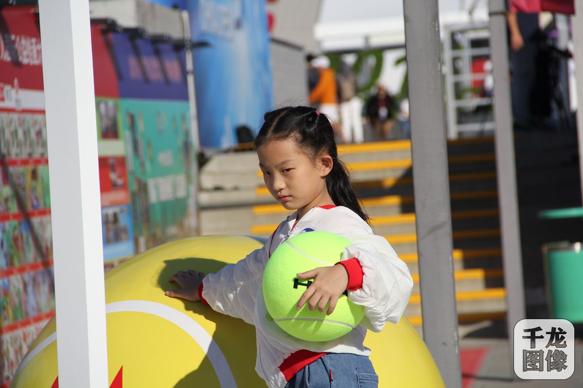 中心迎来了众多的观众。图为小朋友在国家网球中心拍照留念。千龙网记者 黄业摄