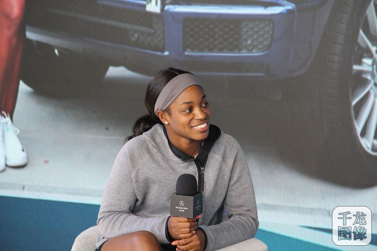随着十一长假的到来,国家网球中心迎来了众多的观众。图为美国选手斯蒂芬斯在赞助商展位与观众互动。千龙网记者 黄业摄