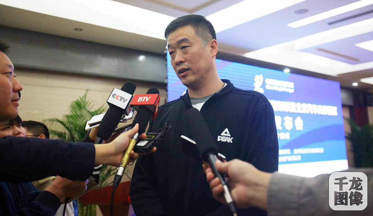 10月8日,2018-2019中国排球超级联赛北京汽车光彩赛区新闻发布会在木樨园体育运动技术学校游泳馆二层多动能厅召开。图为北汽女排主教练张建章接受记者采访。千龙网记者 戚连民摄