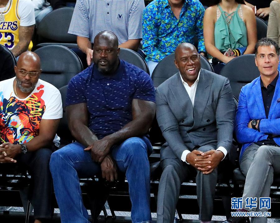 10月10日,前NBA球员魔术师约翰逊(右二)和奥尼尔(左二)在场边观战。 当日,在2018-2019赛季NBA季前赛中,洛杉矶湖人队主场以123比113战胜金州勇士队。 新华社记者李颖摄
