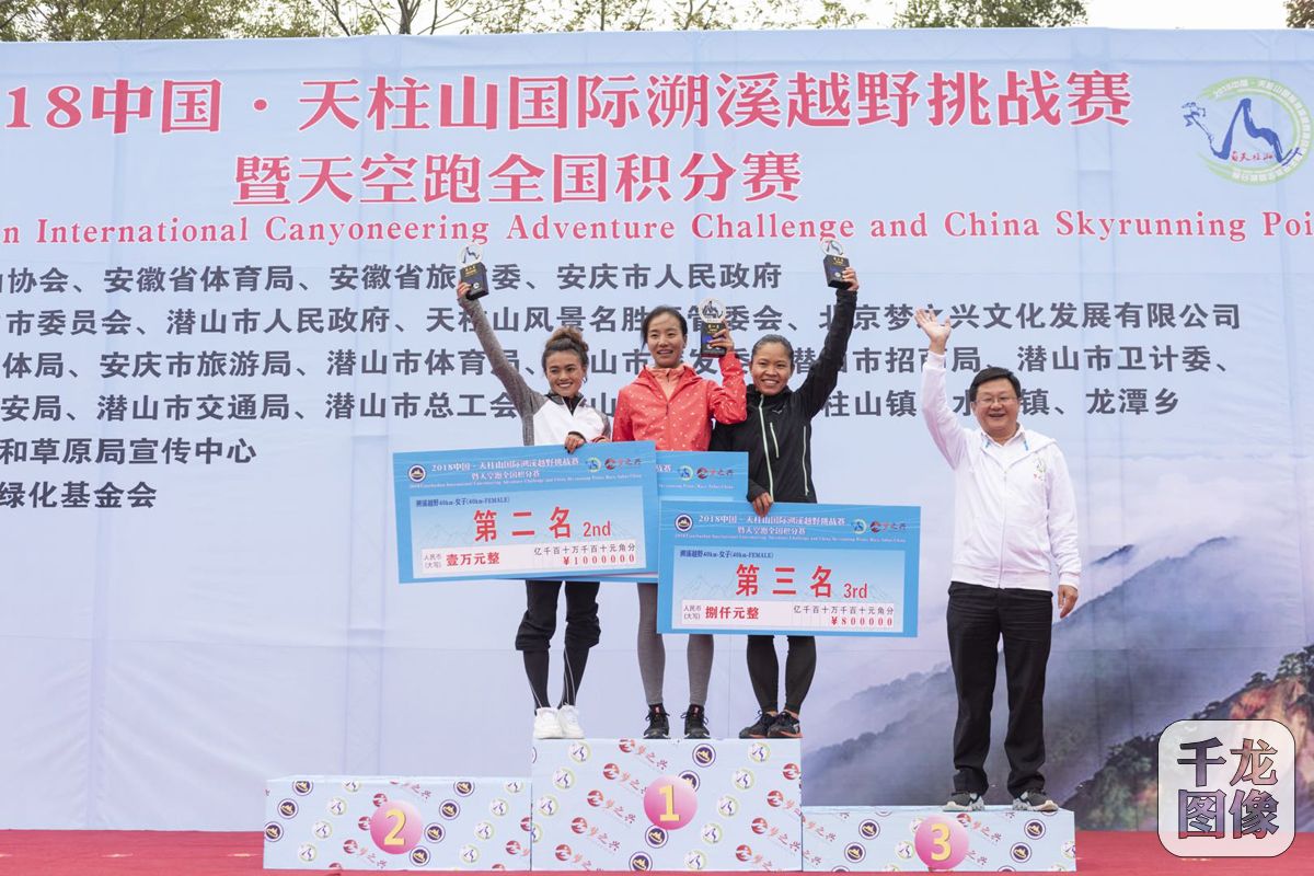10月14日, 2018中国·天柱山国际溯溪越野挑战赛暨天空跑全国积分赛在安徽省安庆市潜山市天柱山景区举行。赛事吸引20个国家和地区的近5800位山地户外爱好者报名参赛。图为赛后颁奖仪式。千龙网发 主办方供图