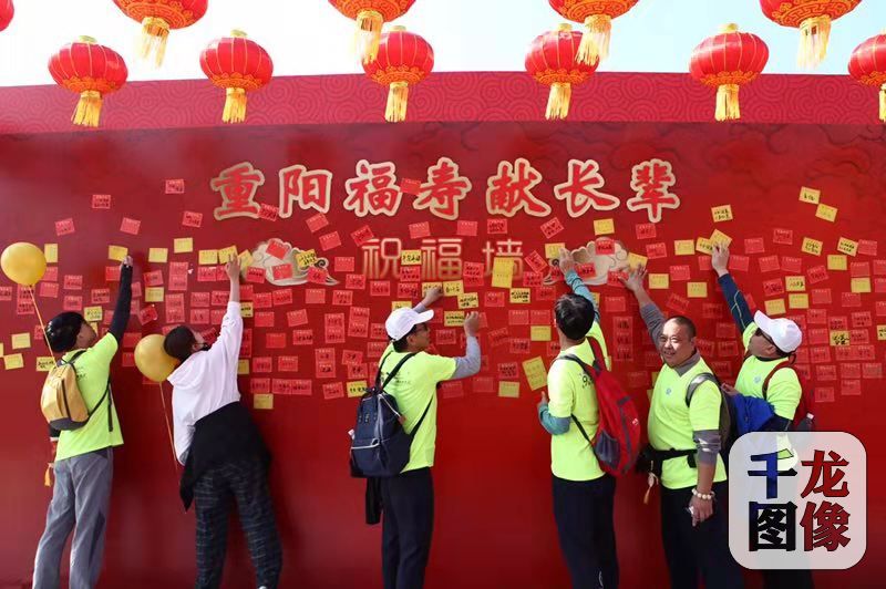 10月13日,以“登高赏秋,祈福重阳”为主题的重阳节徒步活动在第九届北京国际山地徒步大会清水站举行。图为活动现场众多徒步爱好者情系许愿墙、共度重阳节尽享金秋美景。千龙网发 主办方供图