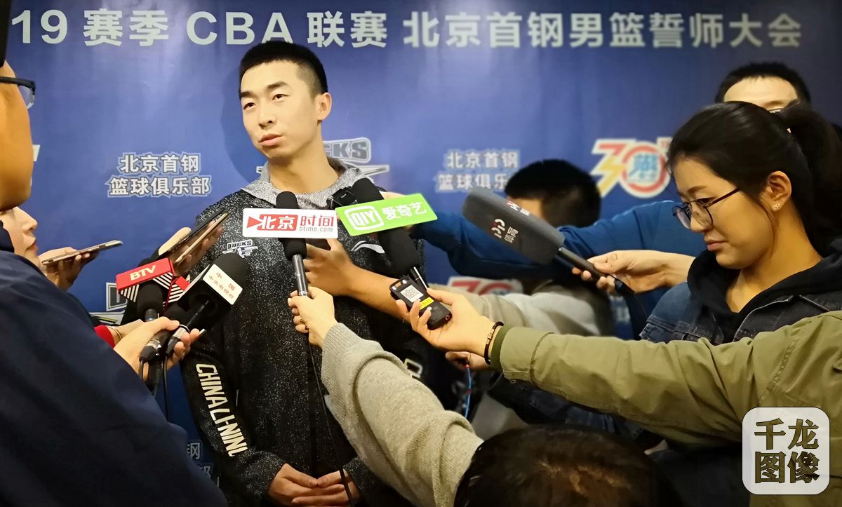 10月16日,北京首钢男篮2018-19赛季CBA联赛誓师大会在首钢篮球中心举行,首钢体育CEO、北京首钢篮球俱乐部董事长秦晓雯和主帅雅尼斯带领的首钢男篮全体将士出席活动,同时受邀参与本次誓师大会的还有刚组建的首钢男篮助威团部分成员。图为北京首钢篮球俱乐部王骁辉接受记者采访。千龙网记者 戚连民摄
