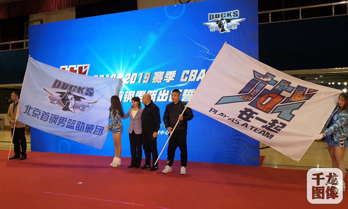 10月16日,北京首钢男篮2018-19赛季CBA联赛誓师大会在首钢篮球中心举行,首钢体育CEO、北京首钢篮球俱乐部董事长秦晓雯和主帅雅尼斯带领的首钢男篮全体将士出席活动,同时受邀参与本次誓师大会的还有刚组建的首钢男篮助威团部分成员。图为北京首钢篮球俱乐部董事长秦晓雯和首钢男篮主教练雅尼斯代表全队向助威团代表分别赠送了首钢男篮助威团团旗和代表首钢篮球俱乐部的鸭标旗。千龙网记者 戚连民摄