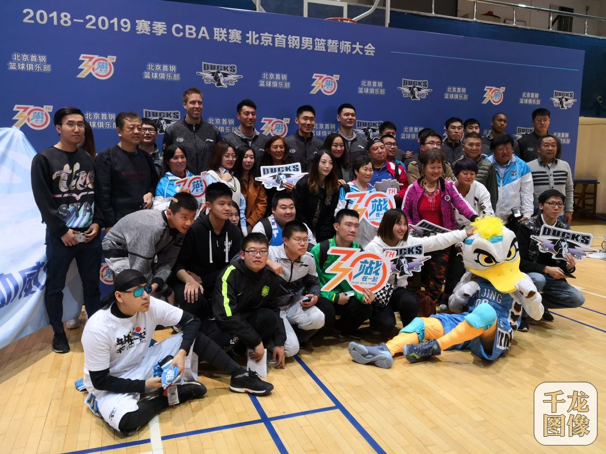 10月16日,北京首钢男篮2018-19赛季CBA联赛誓师大会在首钢篮球中心举行,首钢体育CEO、北京首钢篮球俱乐部董事长秦晓雯和主帅雅尼斯带领的首钢男篮全体将士出席活动,同时受邀参与本次誓师大会的还有刚组建的首钢男篮助威团部分成员。图为北京首钢篮球俱乐部队员合球迷合影。千龙网记者 戚连民摄