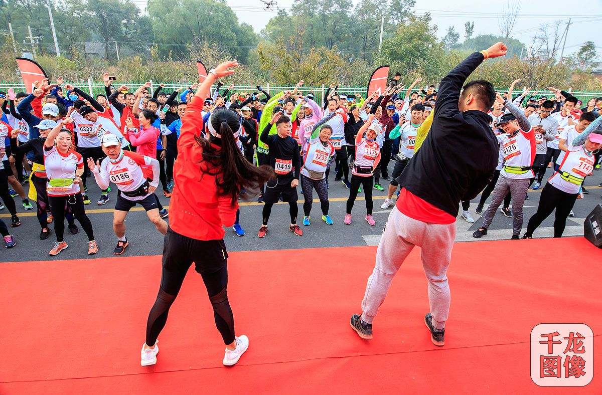 10月14日,“2018北京市体育公益活动社区行暨延庆区第三届柳沟半程马拉松·家庭亲子跑”活动在延庆区井庄镇柳沟村举行。图为马拉松比赛出发前选手热身。千龙网发 马柯摄