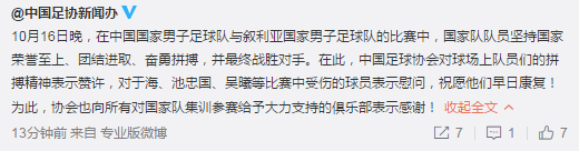 “10月16日晚,在中国国家男子足球队与叙利亚国家男子足球队的比赛中,国家队队员坚持国家荣誉至上、团结进取、奋勇拼搏,并最终战胜对手。在此,中国足球协会对球场上队员们的拼搏精神表示赞许,对于海、池忠国、吴曦等比赛中受伤的球员表示慰问,祝愿他们早日康复!