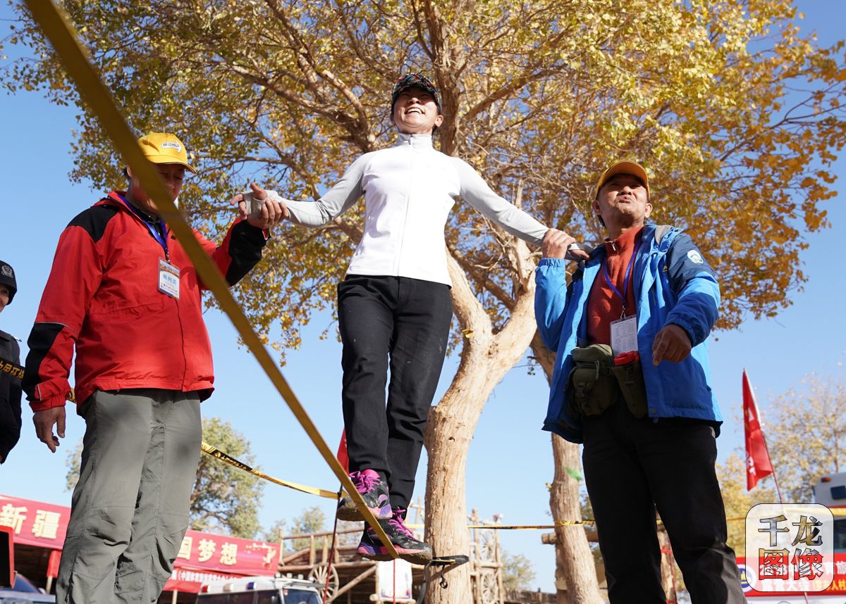 10月20日,2018中国体育旅游露营大会在新疆尉犁县国家4A级风景区罗布人村寨举行。为期两天的大会吸引了来自全国各地近千名户外爱好者参加。图为走扁带大赛。千龙网发 萧峰摄
