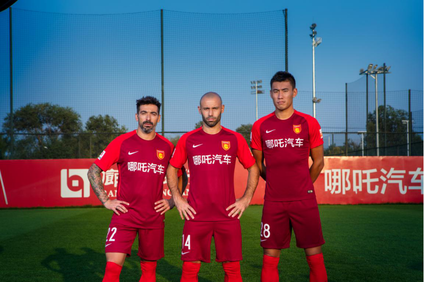 身穿印有“哪吒汽车”字样的河北华夏幸福球员拉维奇、马斯切拉诺、张呈栋