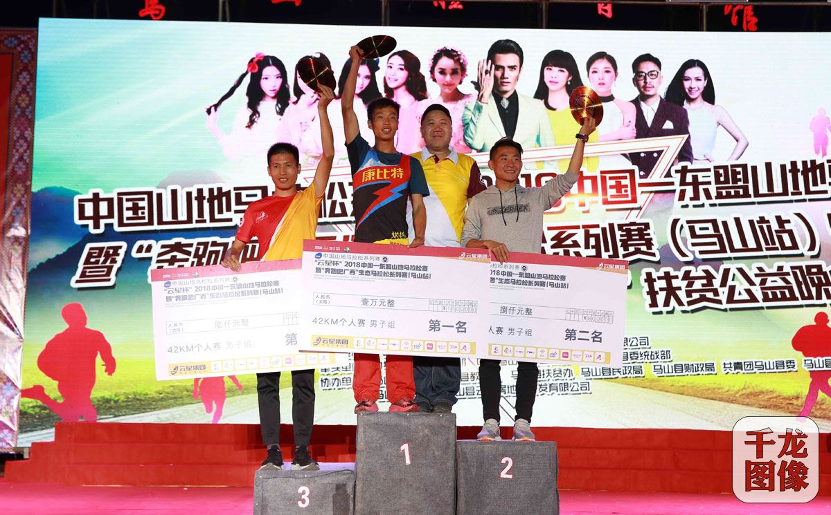 11月4日,2018中国—东盟山地马拉松赛暨“奔跑吧广西”生态马拉松系列赛马山站在马山县举行,来自中国、美国、英国等十二个国家和地区共3000名山地马拉松健将和长跑爱好者一起参加了比赛。图为男子组颁奖仪式。千龙网发 中国登山协会供图
