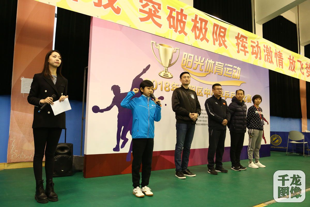 11月4日,2018年阳光体育朝阳区中小学生乒乓球比赛在朝阳区体育局乒乓球训练馆举办。朝阳区的50多所中小学,共计200多名中小学生,参加了本次赛事。图为运动员代表宣誓。千龙网发 主办方供图