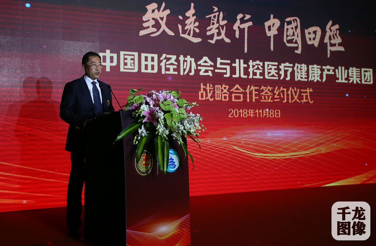 11月8日,中国田径协会与北控医疗健康集团战略签约仪式在雁栖湖举行,未来双方将充分利用各自优势,增强资源共享水平,提升市场开发程度,以提高中国田径的整体竞技水平为目标,调动各方资源为体育强国建设和实现全民健康贡献力量。图为国家体育总局田径运动管理中心主任、中国田径协会副主席兼秘书长于洪臣致辞。千龙网记者 戚连民摄