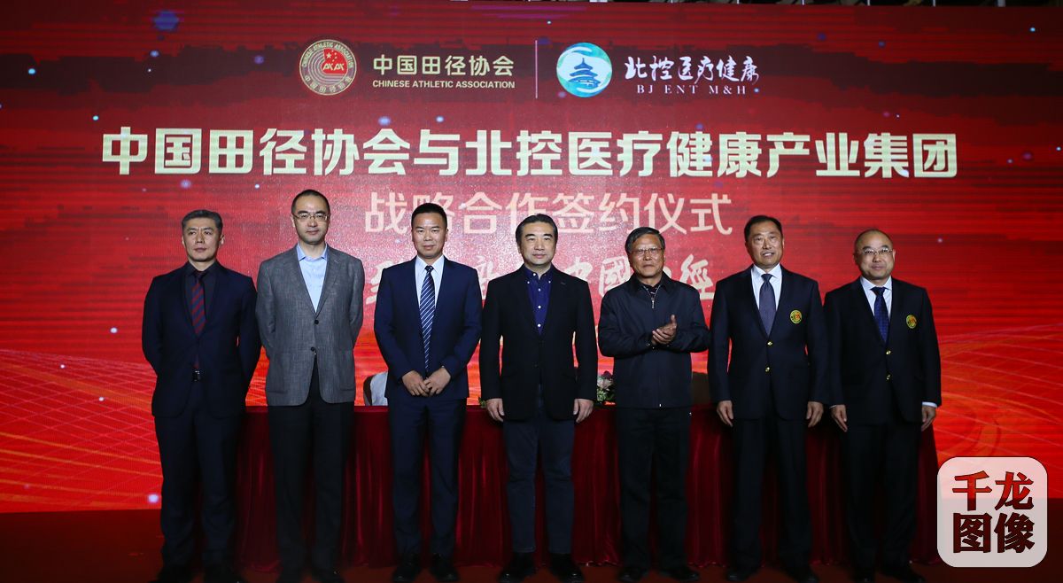 11月8日,中国田径协会与北控医疗健康集团战略签约仪式在雁栖湖举行,未来双方将充分利用各自优势,增强资源共享水平,提升市场开发程度,以提高中国田径的整体竞技水平为目标,调动各方资源为体育强国建设和实现全民健康贡献力量。图为与会嘉宾合影留念。千龙网记者 戚连民摄