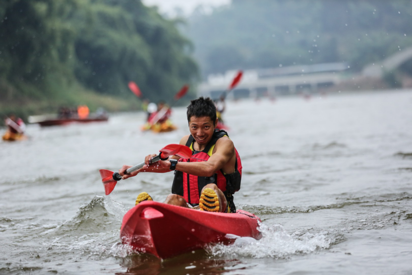 在结束了事故频出的自行车项目后,选手们进入了皮划艇项目阶段,众人挥桨划行在清澈灵秀的濑溪河里,在这条紧邻万灵古镇的清澈河面上选手们需要往返三次,在挑战自身体力的同时,也顺便感受到了古镇的风采和当地人的热情助威。
