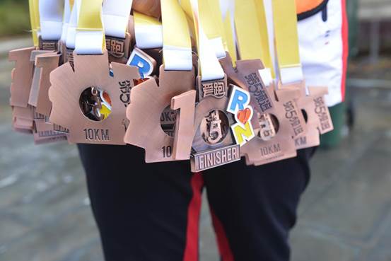 凉风拂面,叮叮作响的敲击声,飒爽又悦耳。原是赛事终点的志愿者们已准备好了完赛奖牌。《第5频道》杂志创刊十周年纪念奖牌以“5”为心,以“10”为形,你中有我我中有你,交相呼应,与现场一片荧光绿的参赛服,一起洋溢着青春与运动的光!