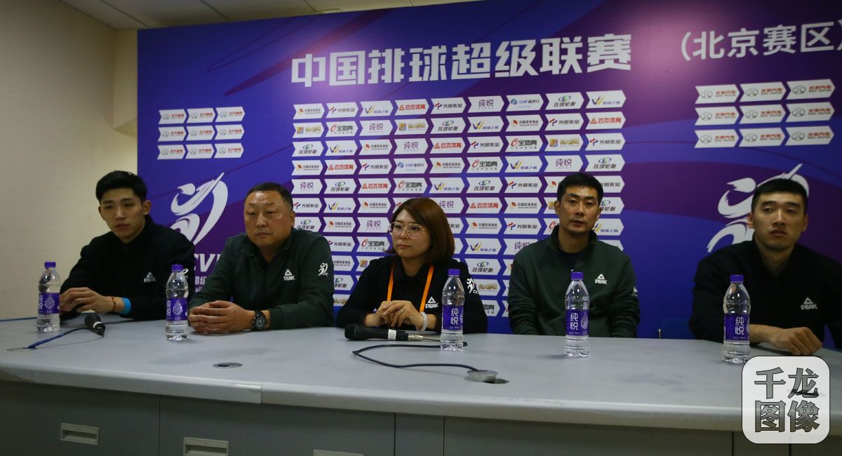 11月11日,2018-2019中国男排超级联赛第二阶段比赛在北京赛区首轮角逐中,坐镇光彩体育馆的北汽男排直落3局击败八一队,为冲冠征程开了个好头。图为赛后发布会双方教练点评比赛。千龙网记者 戚连民摄