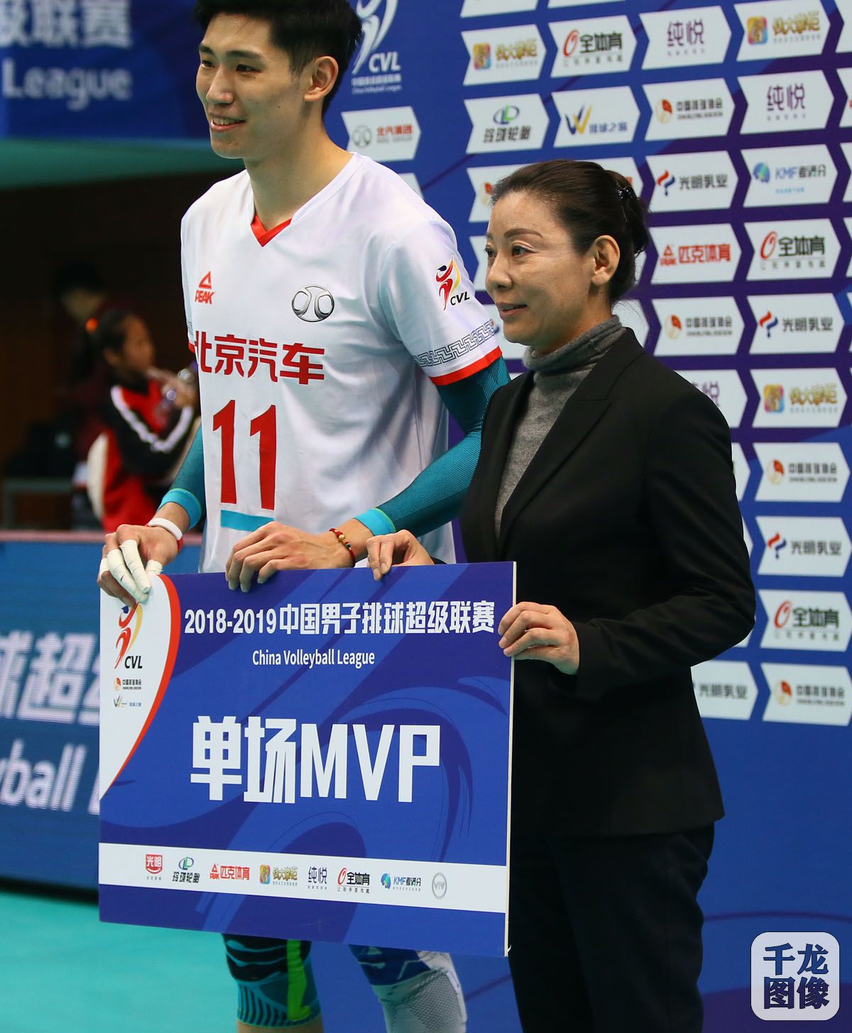 11月11日,2018-2019中国男排超级联赛第二阶段比赛在北京赛区首轮角逐中,坐镇光彩体育馆的北汽男排直落3局击败八一队,为冲冠征程开了个好头。图为本场比赛江川被评为单场MVP。千龙网记者 戚连民摄