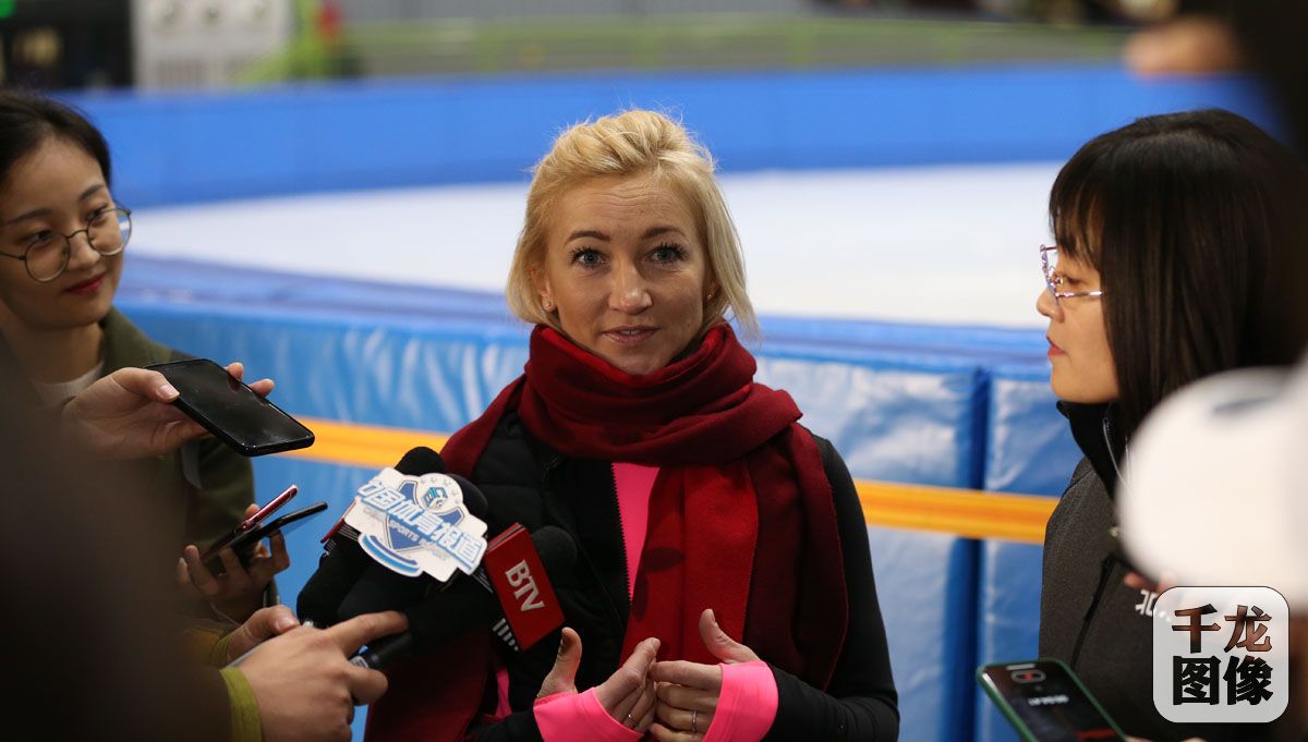 11月13日,记者探营北京市花样滑冰队,目睹了2018年平昌冬奥会花样滑冰双人滑冠军阿里尤娜·萨维申科对队员技术指导的全过程。图为阿里尤娜·萨维申科接受记者采访。千龙网发 北京市体育局供图