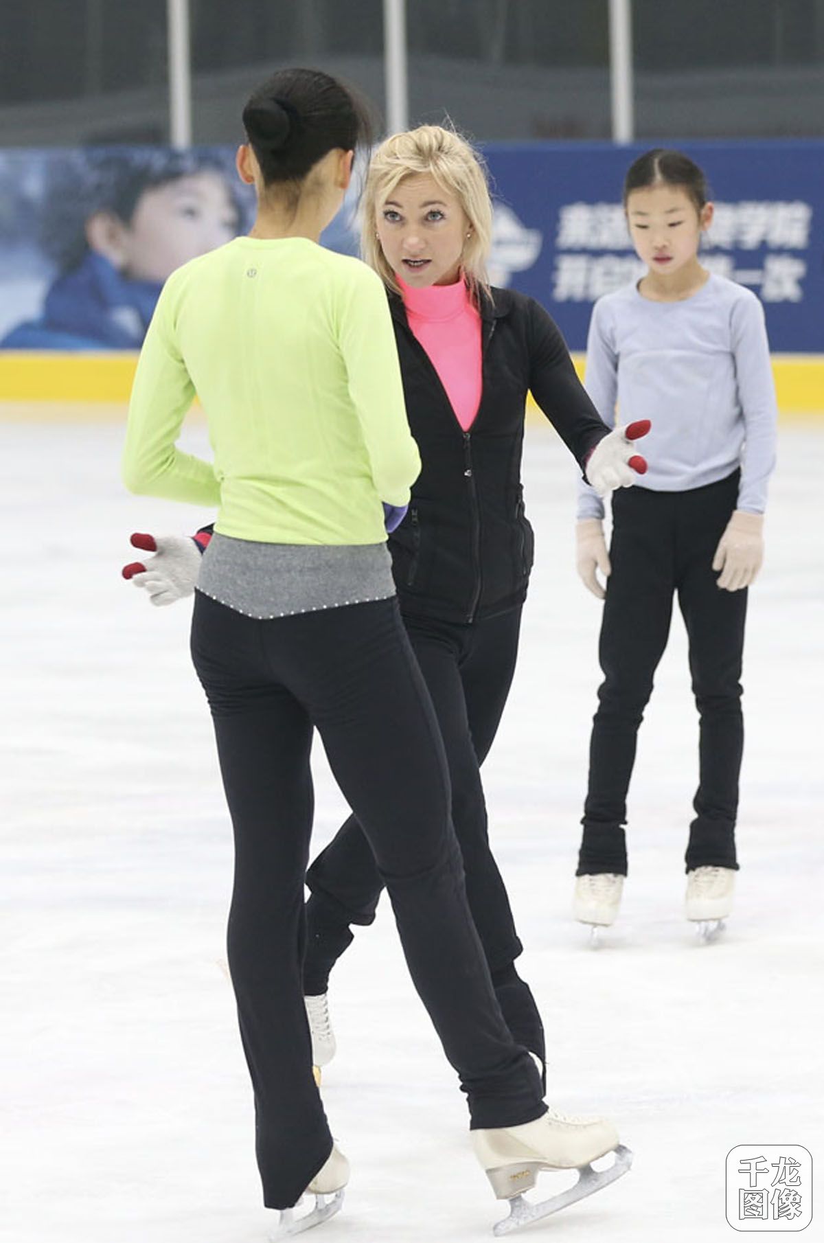 11月13日,记者探营北京市花样滑冰队,目睹了2018年平昌冬奥会花样滑冰双人滑冠军阿里尤娜·萨维申科对队员技术指导的全过程。图为阿里尤娜·萨维申科为队员做示范。千龙网发 北京市体育局供图