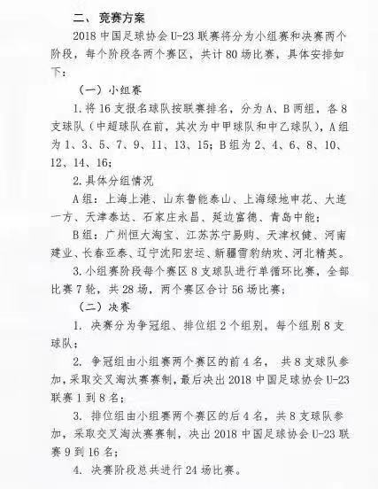 一共有16支球队报名参加U23联赛,共计进行80场比赛,16支队伍分为A、B两组,小组赛阶段每个赛区8支球队进行单循环比赛,全部比赛7轮,共28场,两个赛区合计56场比赛。分组情况如下: