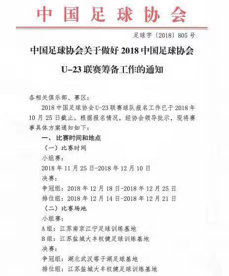 中国足协与近日向各家参加U23联赛的中超、中甲相关俱乐部以及赛区下发筹备工作通知,U23联赛将分成两组进行,小组赛11月25日-12月10日,争冠组以及排位组比赛则在12月14日-12月25日依次完成,比赛地点分别定在了南京江宁足球训练基地、盐城大丰权健足球训练基地以及武汉塔子湖足球训练基地,各队费用自理。