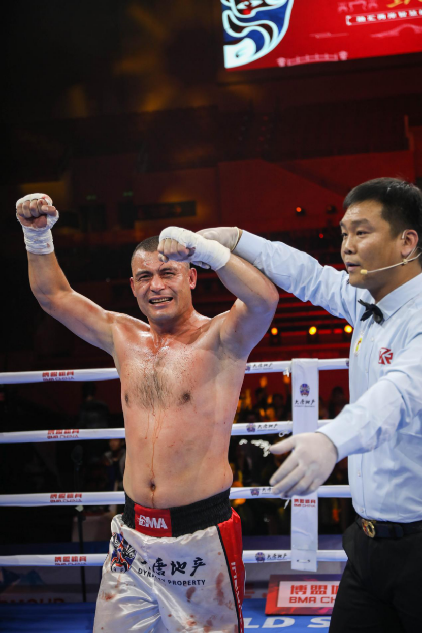 第二场五回合的正赛是91公斤以上级较量,全国冠军再甫拉·买买提与白俄罗斯功勋运动员赛尔赫·卡尔涅狭路相逢。再甫拉·买买提去年在中国拳王赛上表现不俗,而赛尔赫曾获世锦赛季军,击败过奥运亚军“维尔德克星”鲁索,具备世界顶级实力。老将买买提对胜利的渴望十分强烈,开场后一组猛攻险些把赛尔赫击倒在地,赛尔赫也不愧为世界名将,他在熬过被动局面后立即组织有效反击,比赛场面十分火爆。第二回合买买提继续向对手施加压力,赛尔赫则是以逸待劳,趁买买提体能下降时施以重拳打击。后面三个回合的交手陷入胶着,买买提在眉骨受伤流血的不利局面下依旧顽强迎战,双方火拼至第五回合的最后一秒。最终再甫拉·买买提获得了裁判的一致认可,以点数判定击败强敌,取得了分量极重的一场胜利。