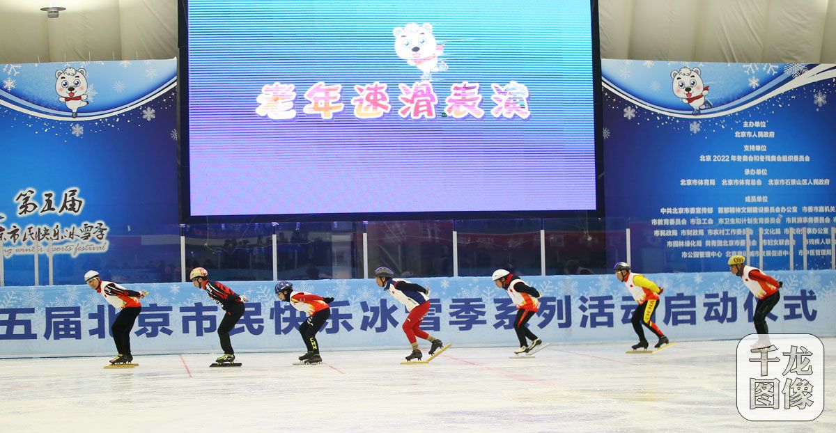 11月18日,第五届北京市民快乐冰雪季系列活动启动仪式在启迪冰雪体育中心举行。图为老年速滑表演。千龙网记者 戚连民摄