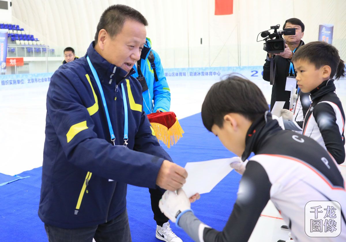 11月18日,第五届北京市民快乐冰雪季系列活动启动仪式在启迪冰雪体育中心举行。图为北京体育总会秘书长王品熙为获奖选手颁奖。千龙网记者 戚连民摄