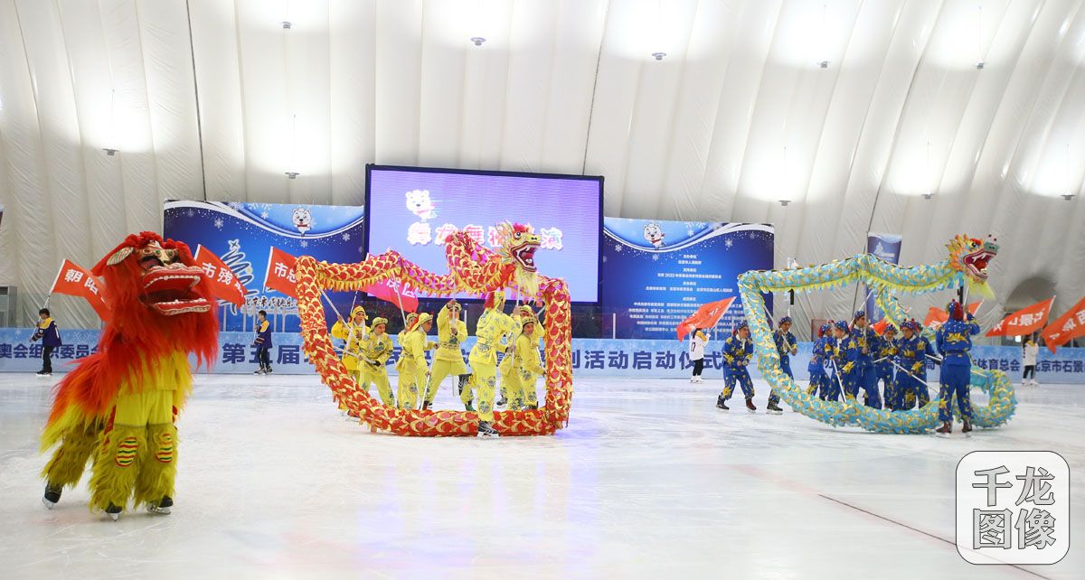 11月18日,第五届北京市民快乐冰雪季系列活动启动仪式在启迪冰雪体育中心举行。图为舞龙舞狮表演。千龙网记者 戚连民摄