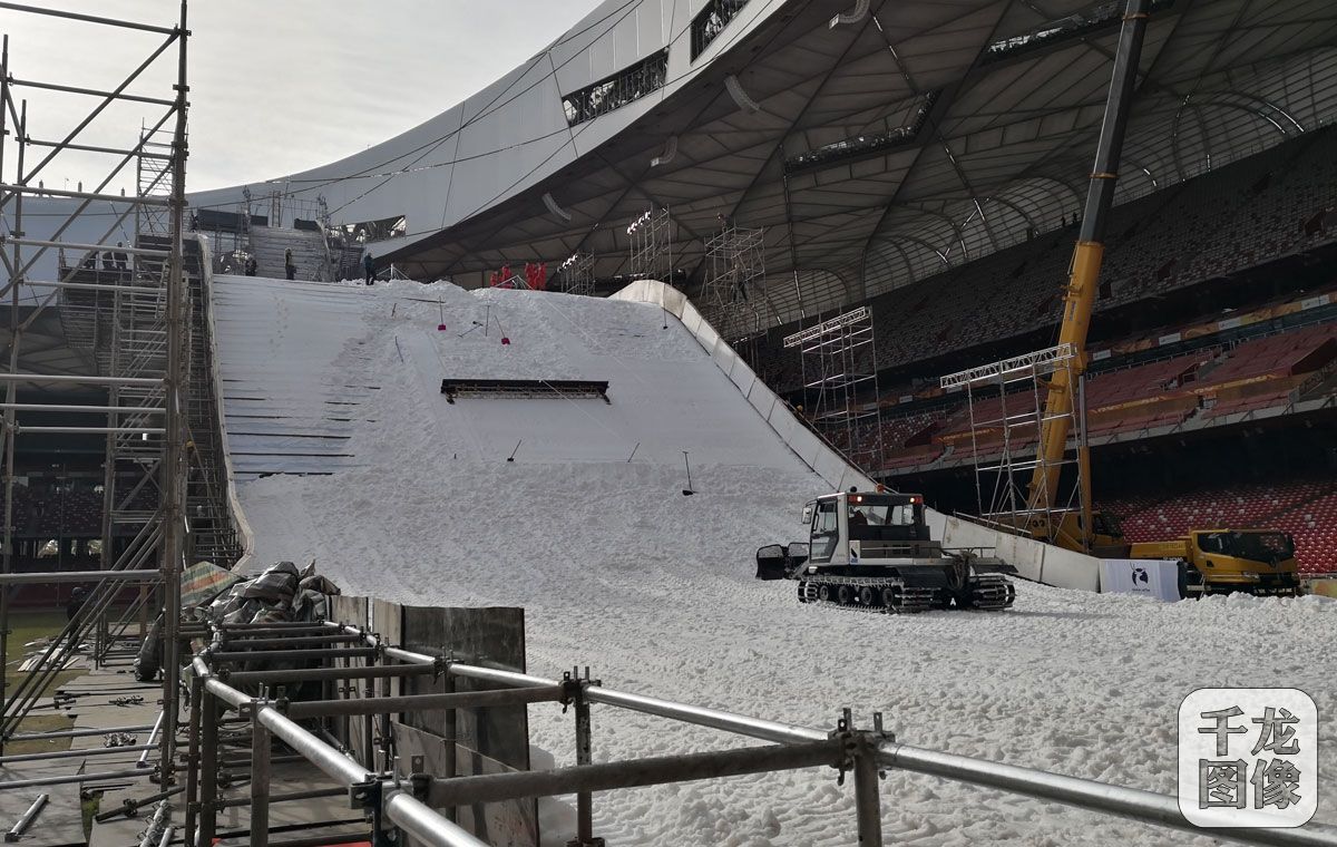 11月23-24日,2018年沸雪北京国际雪联单板滑雪大跳台世界杯在鸟巢举行,鸟巢场内搭建工作紧锣密鼓进行中,目前正在进行碎冰造雪作业。图为工人进行场地搭建工作。千龙网记者 戚连民摄