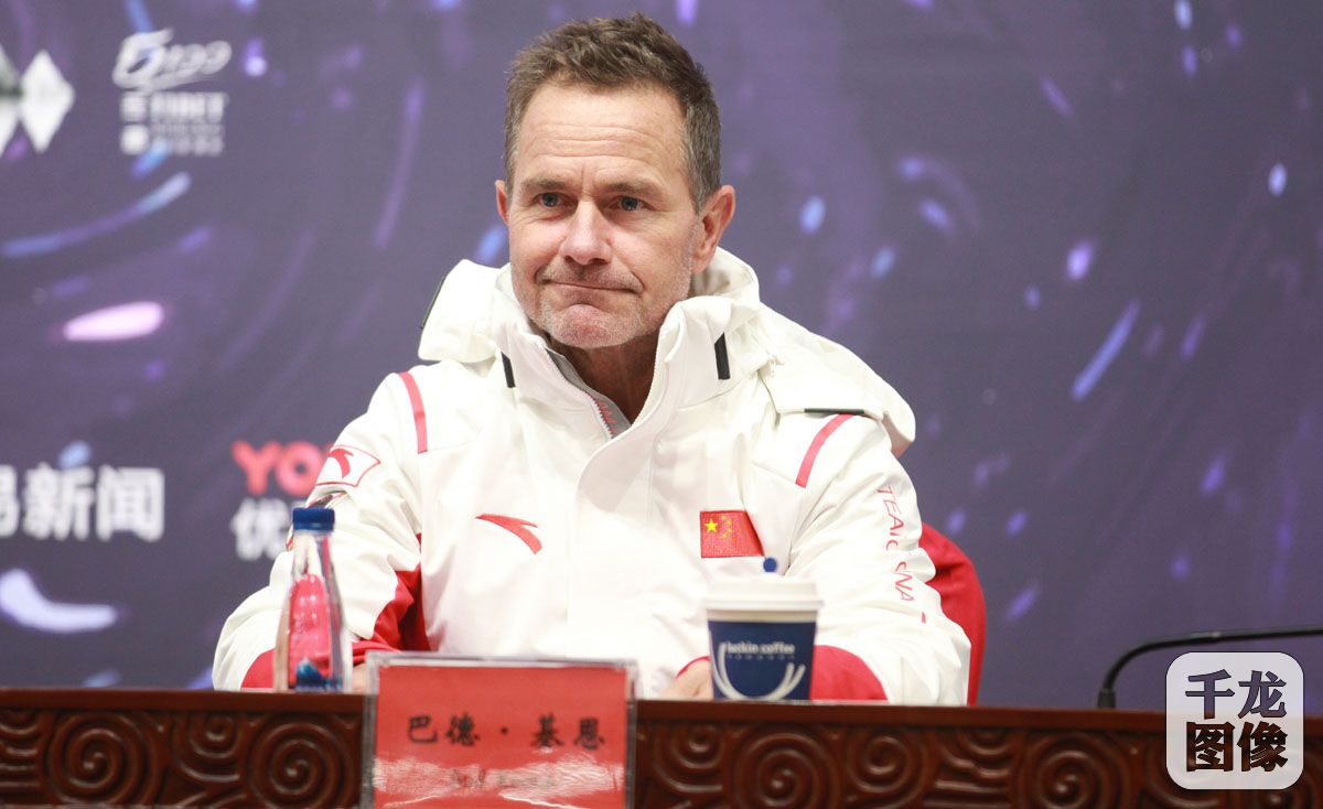 11月22日,2018沸雪北京国际雪联单板滑雪大跳台世界杯运动员与媒体见面会在鸟巢新闻发布厅举行。国际雪联竞赛部主任罗伯特·莫里斯、单板滑雪大跳台和坡面障碍技巧国家队领队周瑾、挪威选手马库斯·克里弗兰、奥地利选手安娜·加塞尔出席了本次见面会。图为中国单板滑雪大跳台及坡面障碍技巧国家集训队新任主教练巴德·基恩。千龙网发 北京市体育局供图