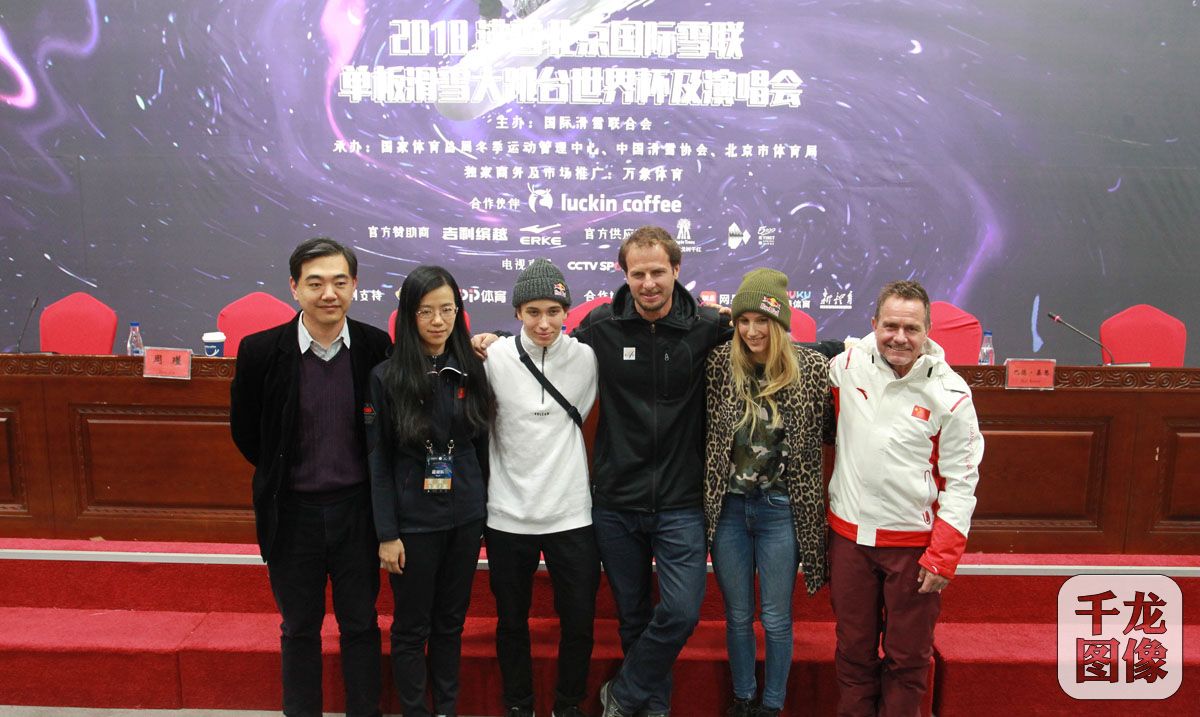 11月22日,2018沸雪北京国际雪联单板滑雪大跳台世界杯运动员与媒体见面会在鸟巢新闻发布厅举行。国际雪联竞赛部主任罗伯特·莫里斯、单板滑雪大跳台和坡面障碍技巧国家队领队周瑾、挪威选手马库斯·克里弗兰、奥地利选手安娜·加塞尔出席了本次见面会。图为见面会现场。千龙网发 北京市体育局供图