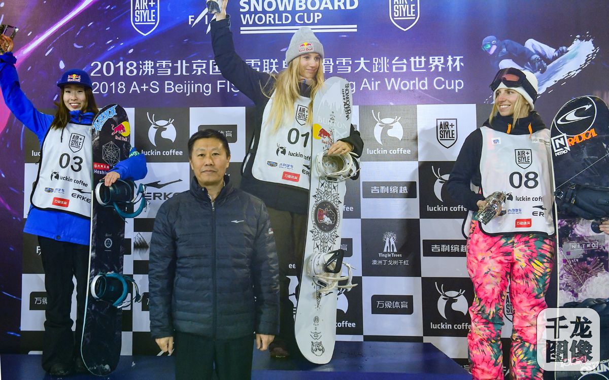 11月24日,2018沸雪北京国际雪联单板滑雪大跳台世界杯在鸟巢落下帷幕,经过两日的激烈比拼,最终,来自瑞典的黑马选手斯文·索格伦和奥地利名将安娜·加塞尔分别获得男子、女子组冠军。图为赛后颁奖仪式。千龙网记者 戚连民摄