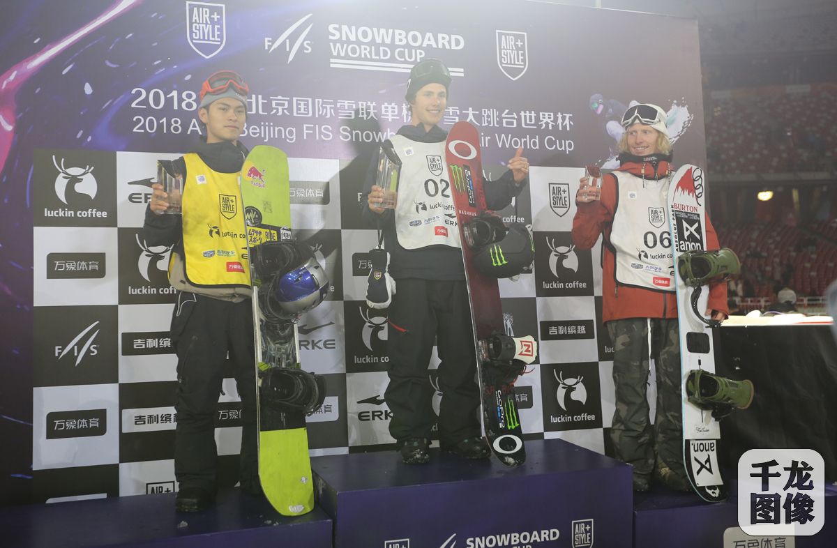 11月24日,2018沸雪北京国际雪联单板滑雪大跳台世界杯在鸟巢落下帷幕,经过两日的激烈比拼,最终,来自瑞典的黑马选手斯文·索格伦和奥地利名将安娜·加塞尔分别获得男子、女子组冠军。图为赛后颁奖仪式。千龙网记者 戚连民摄
