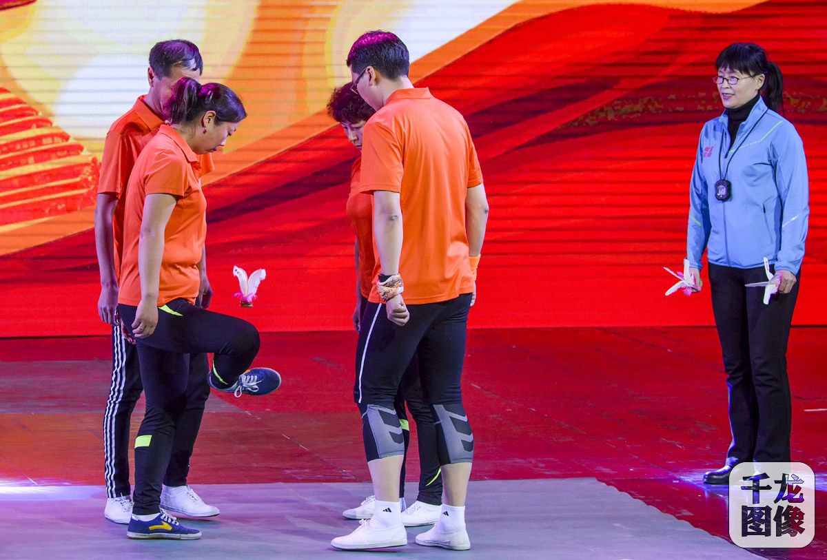 12月8日,2018年全民健身“北京纪录”挑战赛年度总决赛12月8日来到地坛体育馆,300余名健身达人通过比赛、表演等方式,展现着各自的风采,并创造出了2018年的年度“北京纪录”。图为四人传踢毽项目。千龙网发 北京社会体育管理中心供图