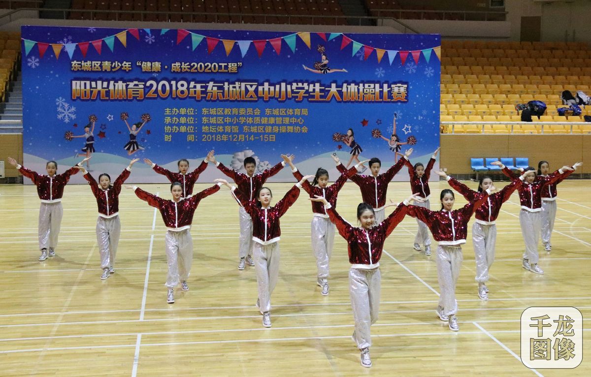 12月14日,由东城区健身操舞协会协办的阳光体育2018年东城区中小学生大体操比赛在地坛体育馆举行。比赛设啦啦操、排舞、团体操三个项目。来自东城区中、小、幼共32个参赛单位,69支队伍,近2000名学生在这里展示他们的自信、魅力与激情。图为比赛现场。千龙网发 东城区健身操舞协会供图