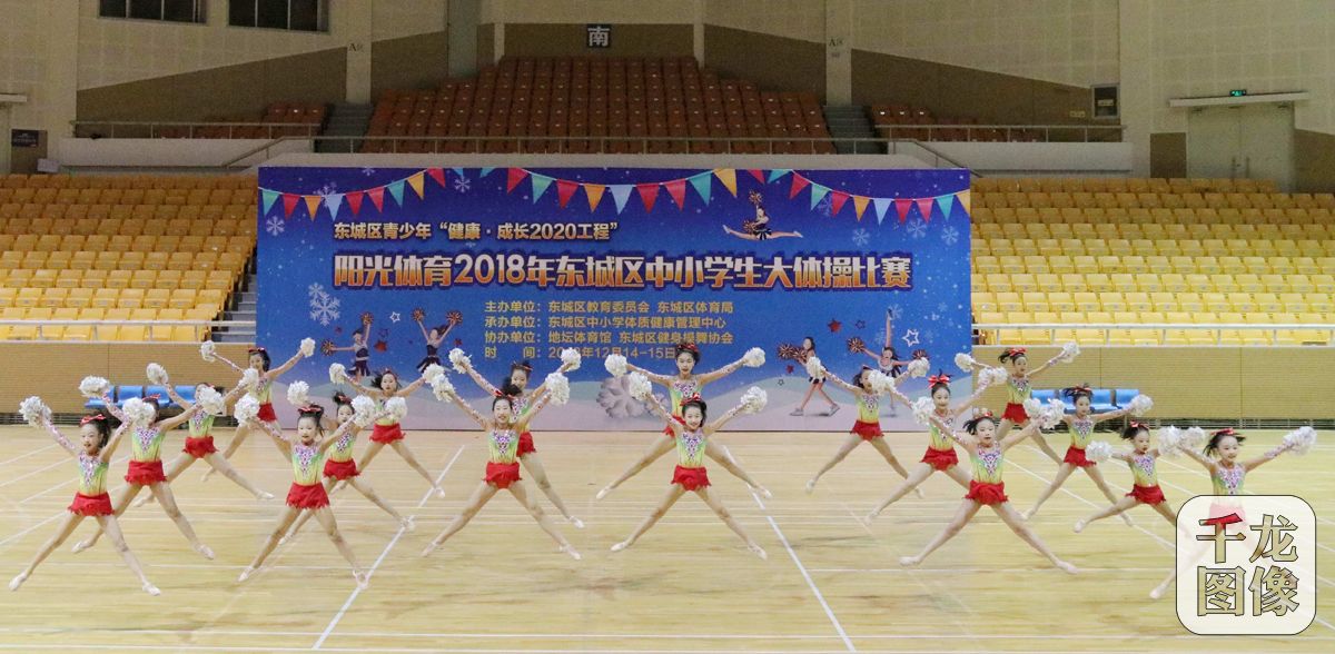 12月14日,由东城区健身操舞协会协办的阳光体育2018年东城区中小学生大体操比赛在地坛体育馆举行。比赛设啦啦操、排舞、团体操三个项目。来自东城区中、小、幼共32个参赛单位,69支队伍,近2000名学生在这里展示他们的自信、魅力与激情。图为比赛现场。千龙网发 东城区健身操舞协会供图