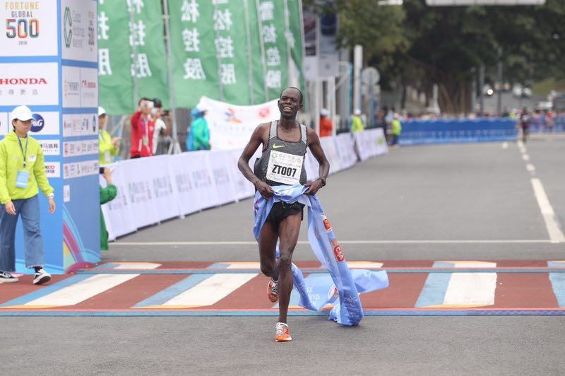 虽然当天略有微雨,气温较低,却没能阻止马拉松爱好者火热的脚步和挑战极限体能的信心。经过激烈角逐,开赛后2小时12分29秒,来自肯尼亚的ELIAS KEMBOI CHELIMO就第一个抵达终点。