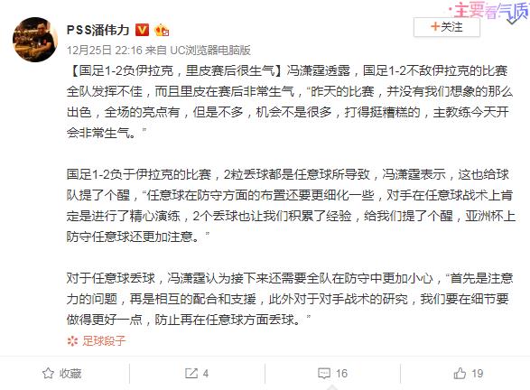 近日,中国男足在多哈的热身赛中以1-2的比分不敌伊拉克,场上的表现和比分让主帅里皮十分不满。据恒大跟队记者潘伟力的介绍,冯潇霆第一时间分享了里皮的心情。