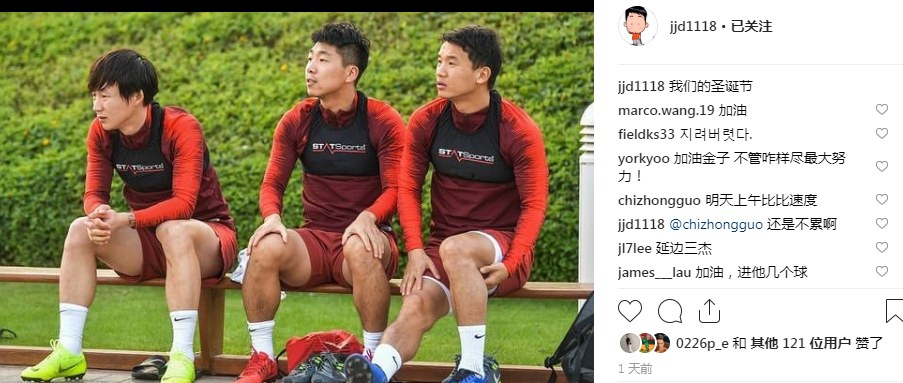 近日,金敬道也在社交平台晒出照片,照片里是“延边三杰”,金敬道、池忠国和朴成,他们坐在场边,换完了装备,准备训练,同时金敬道还发文:“我们的圣诞节”。