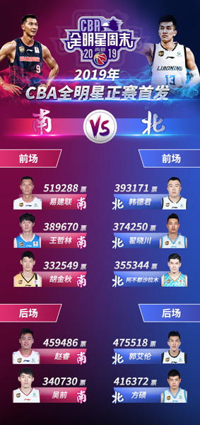 人民网北京12月31日电 经过6周的票选活动,2019年CBA全明星赛首发阵容在2018年12月31日正式揭晓。易建联、王哲林、胡金秋、赵睿、吴前将以南区首发球员身份出战,北区的“先发五虎”则分别是韩德君、翟晓川、阿不都沙拉木、郭艾伦和方硕。值得一提的是,来自广东东莞银行的易建联,以519288票、连续第二年荣膺CBA全明星赛的“票王”。