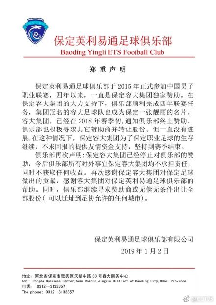 在2日发布的公告中,保定英利易通足球俱乐部表示,将继续寻求赞助商,或无偿无条件出让全部股份,也可以迁址到足协允许的任何城市。
