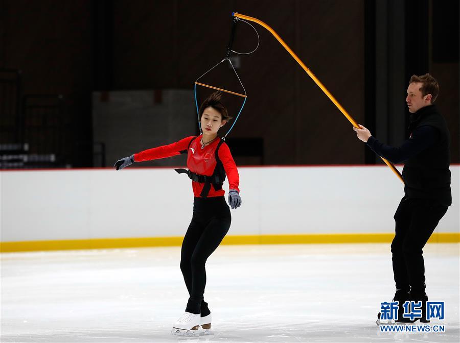 1月9日,花样滑冰运动员彭程(左)在辅助装备的协助下训练。 当日,中国花样滑冰队在北京首钢冬训中心进行训练。 新华社记者王丽莉摄
