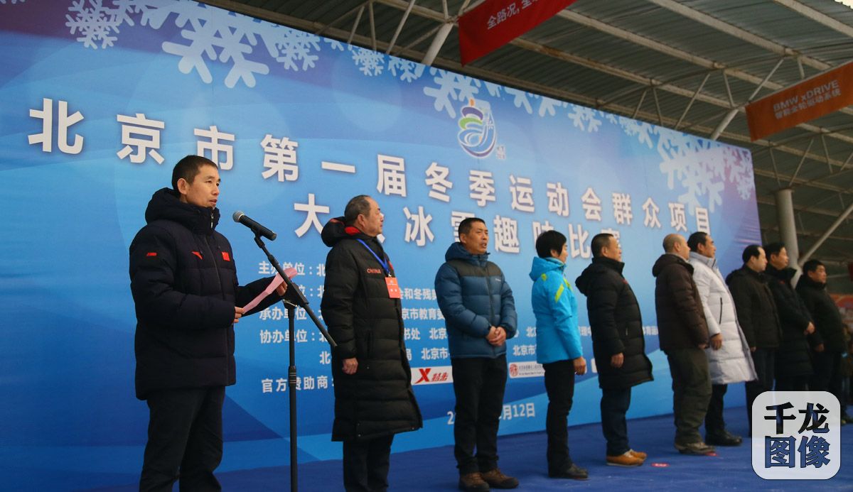 1月12日,北京市第一届冬季运动会群众项目大众冰雪趣味比赛在平谷区渔阳滑雪场举行。共有来自本市15个区和燕山地区、市总工会、市残联等18支代表队,共计1100余名运动员、教练员和裁判员参加。图为北京市体育总会副秘书长张国成主持开幕仪式。千龙网记者 戚连民摄