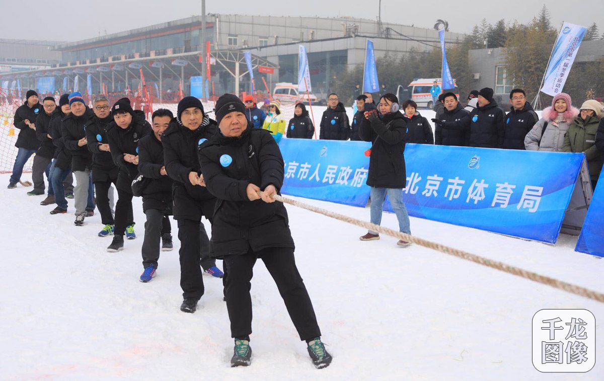 1月12日,北京市第一届冬季运动会群众项目大众冰雪趣味比赛在平谷区渔阳滑雪场举行。共有来自本市15个区和燕山地区、市总工会、市残联等18支代表队,共计1100余名运动员、教练员和裁判员参加。图为拔河比赛现场。千龙网记者 戚连民摄