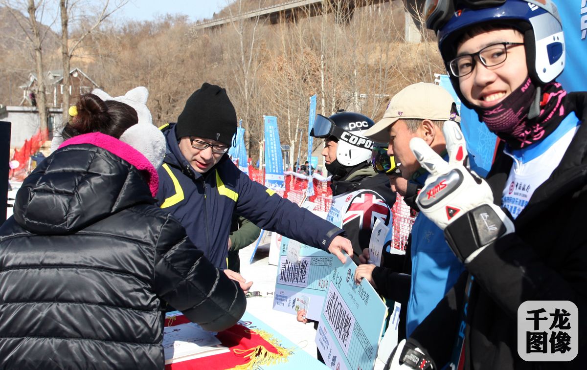 1月26日,第四届大众冰雪北京公开赛高山滑雪比赛在北京怀北国际滑雪场举行。来自本市各行各业近100名选手参加了开幕仪式及比赛。图为北京市体育总会竞赛活动部部长侯鹏程为参赛选手颁奖。千龙网发 北京市体育局新闻中心供图